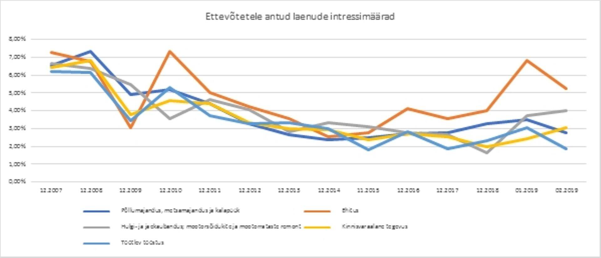 Kui analüüsida laenuintresside tõusu sektorite kaupa, siis Eesti Panga andmetel paistavad kõige suuremad intressid silma ehitussektoris, mis on paljuski seotud ka kinnisvaraarendusega. 2018. aasta lõpu seisuga on kinnisvaralaenude osakaal pankade koondportfellis suurem kui 2007. aasta lõpus. Pangad on ettevaatlikumad ning hindavad selle sektori riske kõrgemalt, et mitte sattuda uuesti kriisile eelnenud olukorda, kus kinnisvara pakkumine ületas tunduvalt nõudlust.