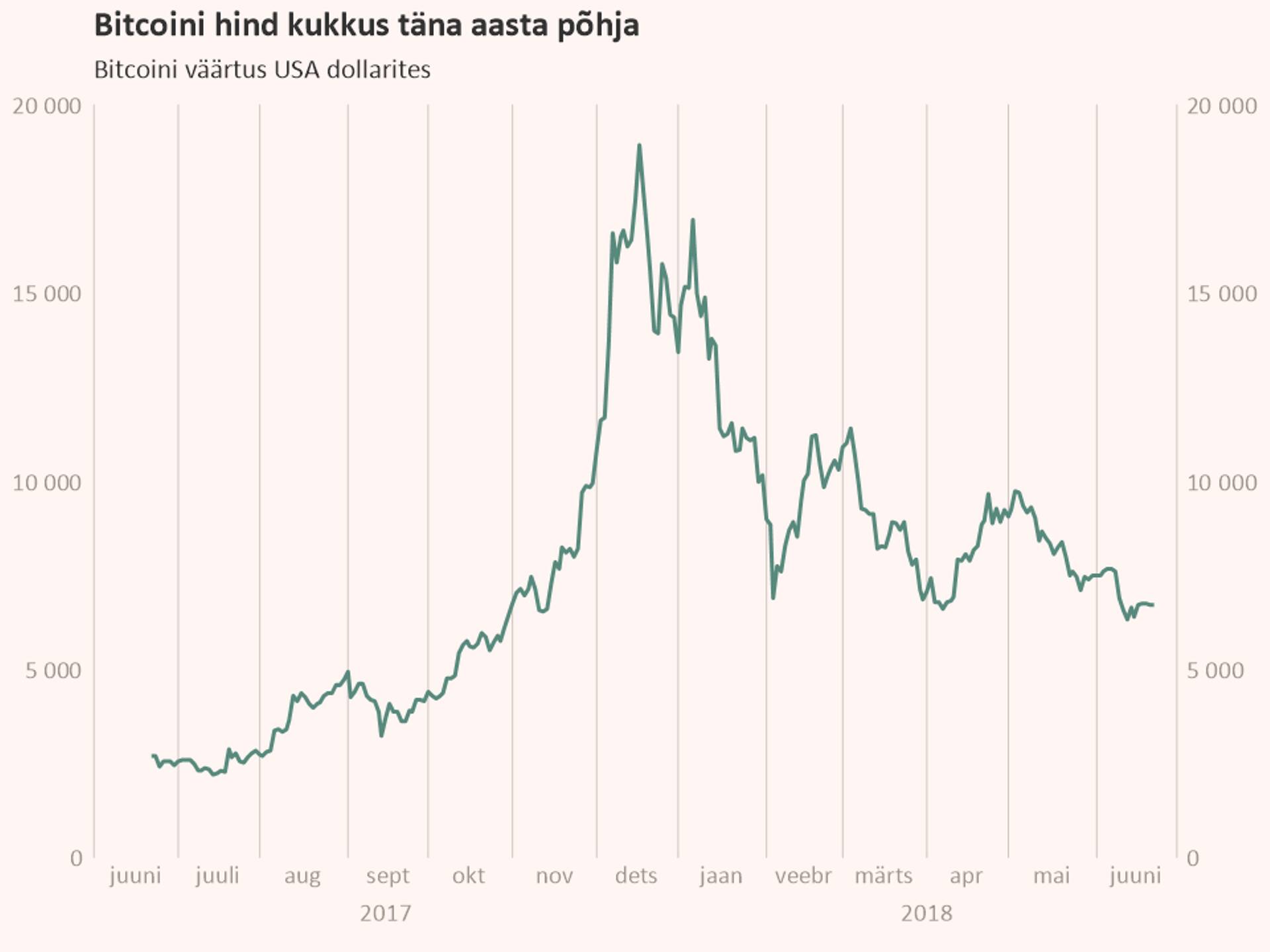 Viimase kuuga on Bitcoini hind odavnenud enam kui 20% võrra ja käesoleval aastal ligi 60% võrra. Detsembri tipust, mil Bitcoini hind lähenes 20 000 dollari piirile, on selle hind langenud ligi 70%.