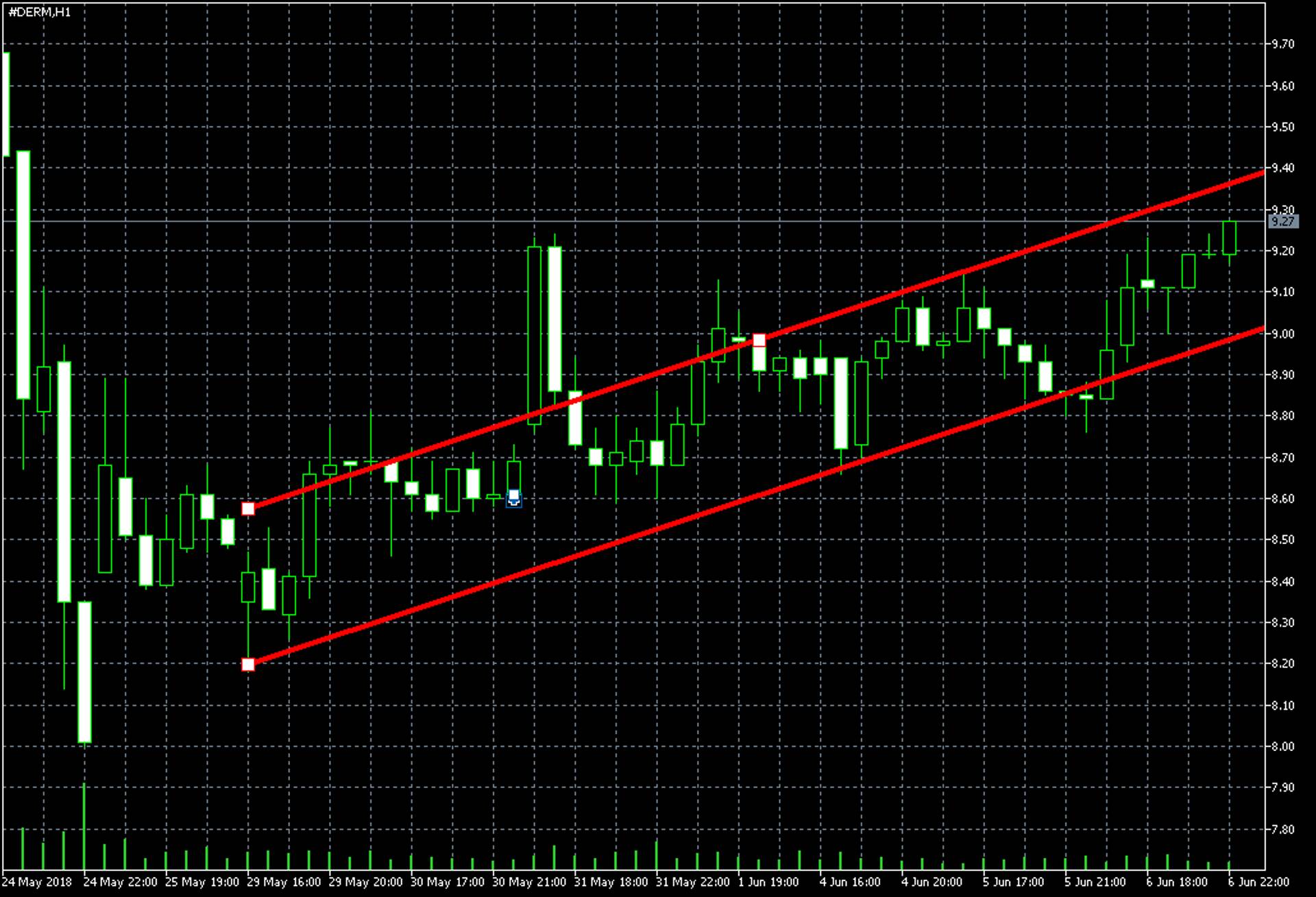 Passisin Dermira aktsiat juba paar nädalat ja 27. mail tundus mulle, et ülesjooks on alanud. Ootasin veel paar päeva, et olla ülespidi suunas kindel, ja võtsin siis positsiooni, 100 aktsiat (täpsemalt aktsia CFDd) hinnaga 8,69 dollarit tükk.