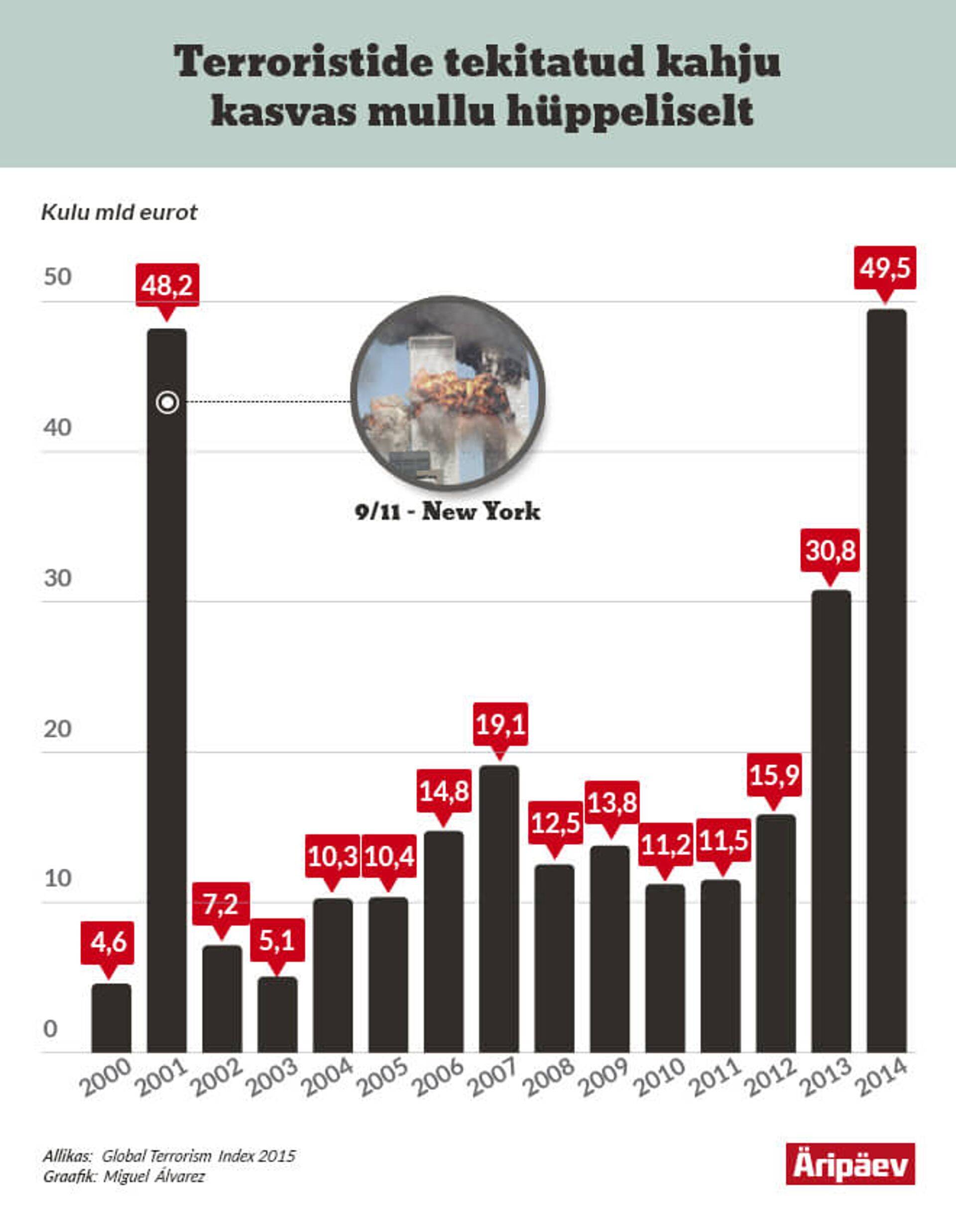 Terrorirünnakutes surma saanud inimeste arv on hüppeliselt kasvanud, ülesmäge on roninud ka terrorismi poolt põhjustatud kahjud, mis pikas plaanis õõnestavad ka riikide majandusi.